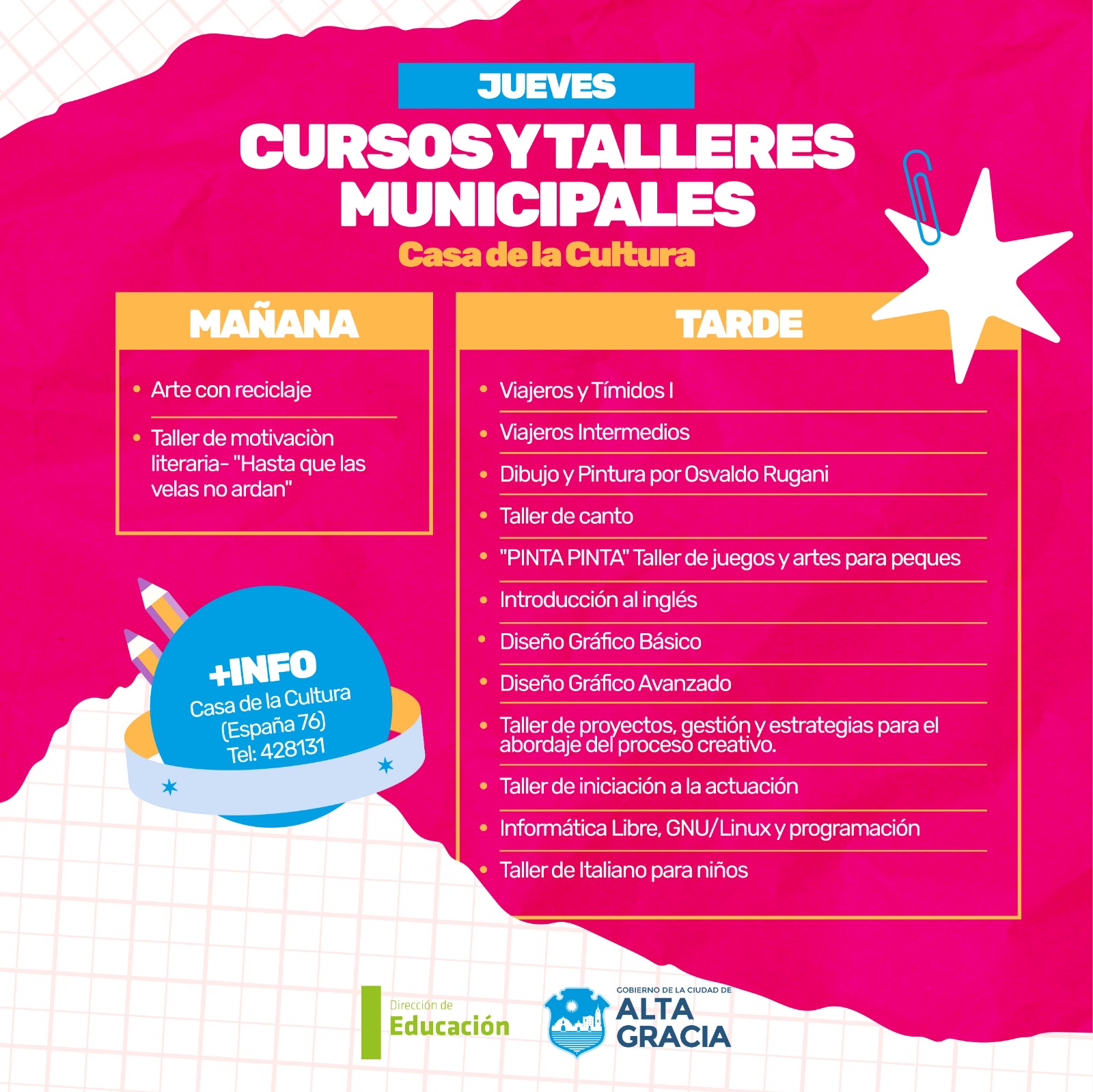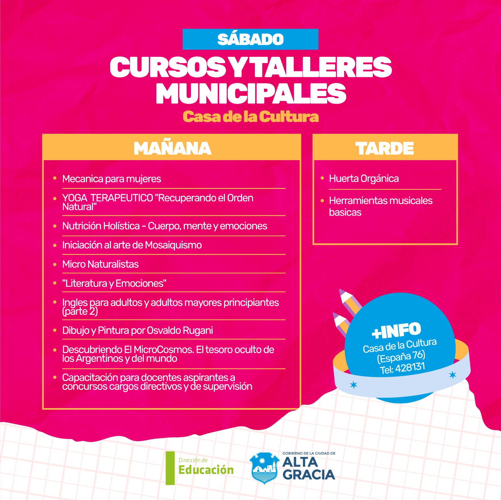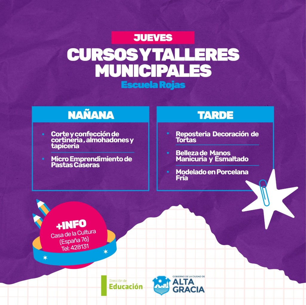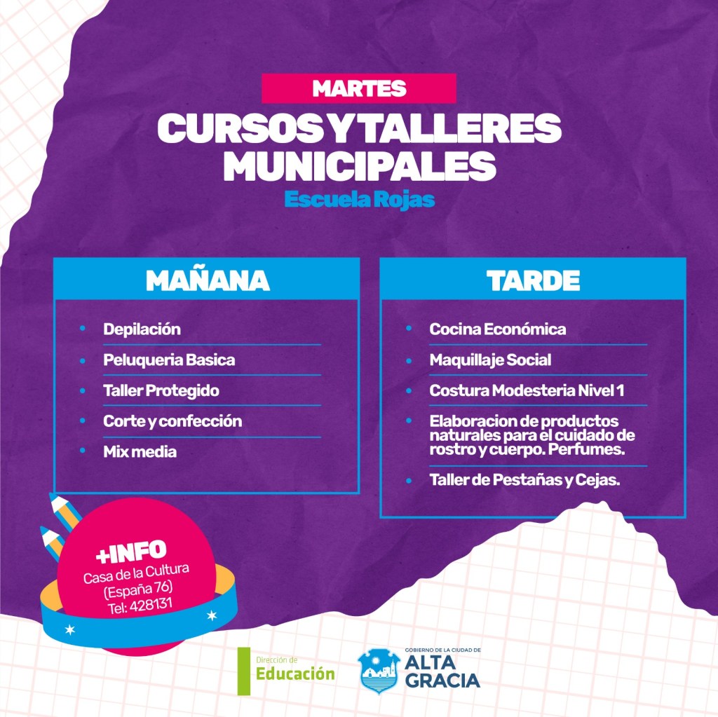 Por primera vez, la Dirección de Educación dependiente de la Secretaría de Gestión Publica, Turismo Cultura y Deportes del Gobierno de Alta Gracia, pone a disposición más de 100 propuestas de formación en oficios, arte, salud, idiomas, nuevas tecnologías y ambiente, con la intención de brindar más educación y con ello más oportunidades a los vecinos y vecinas de nuestra ciudad.