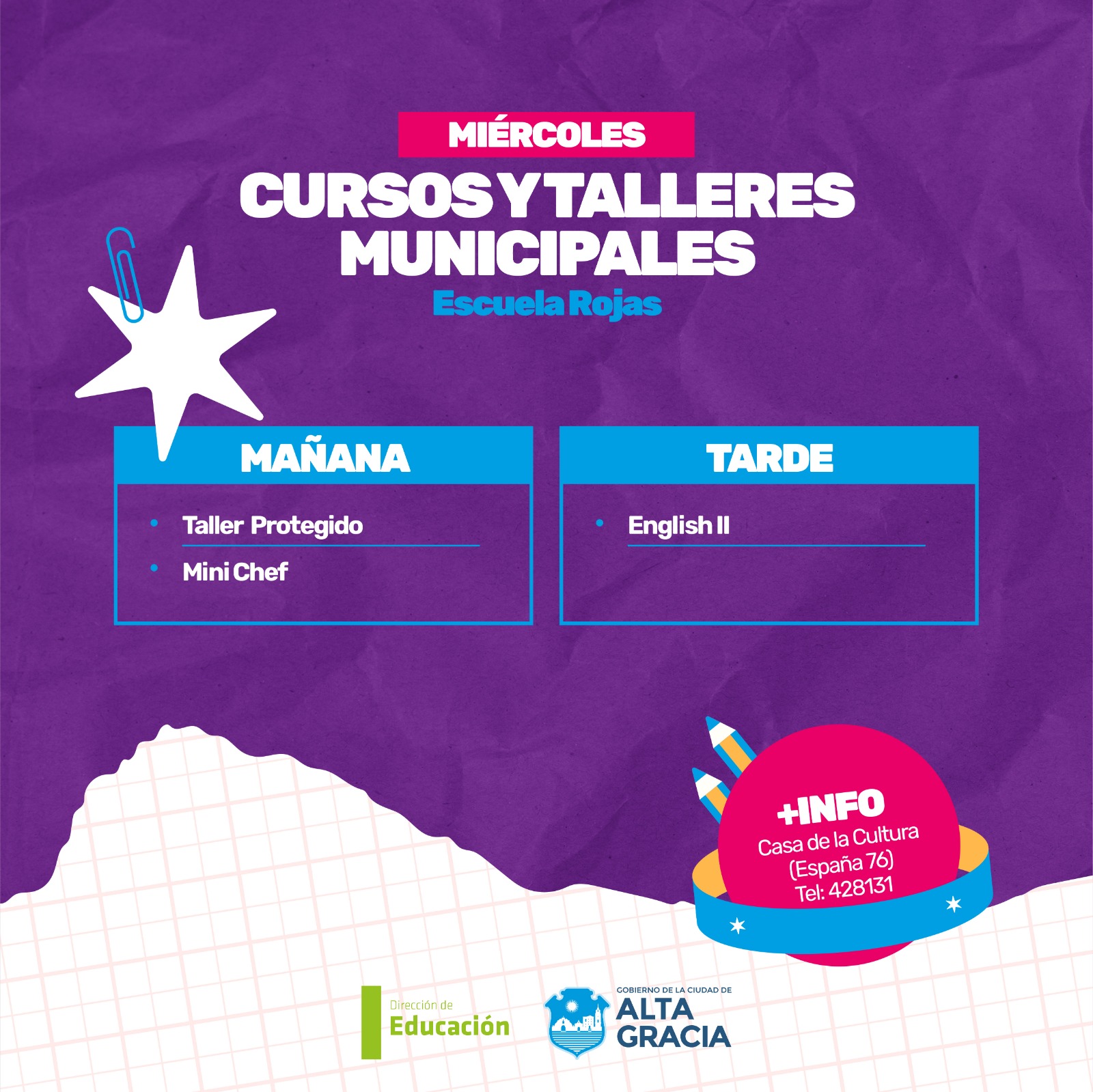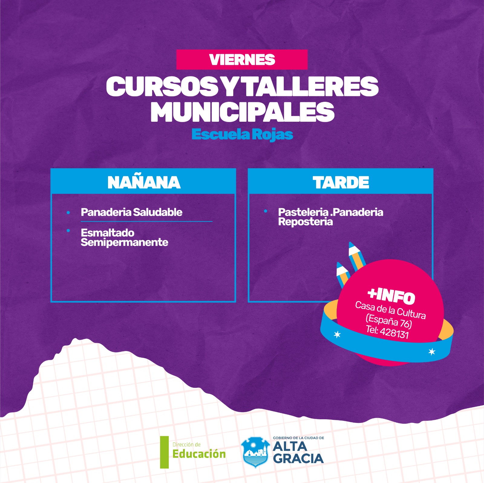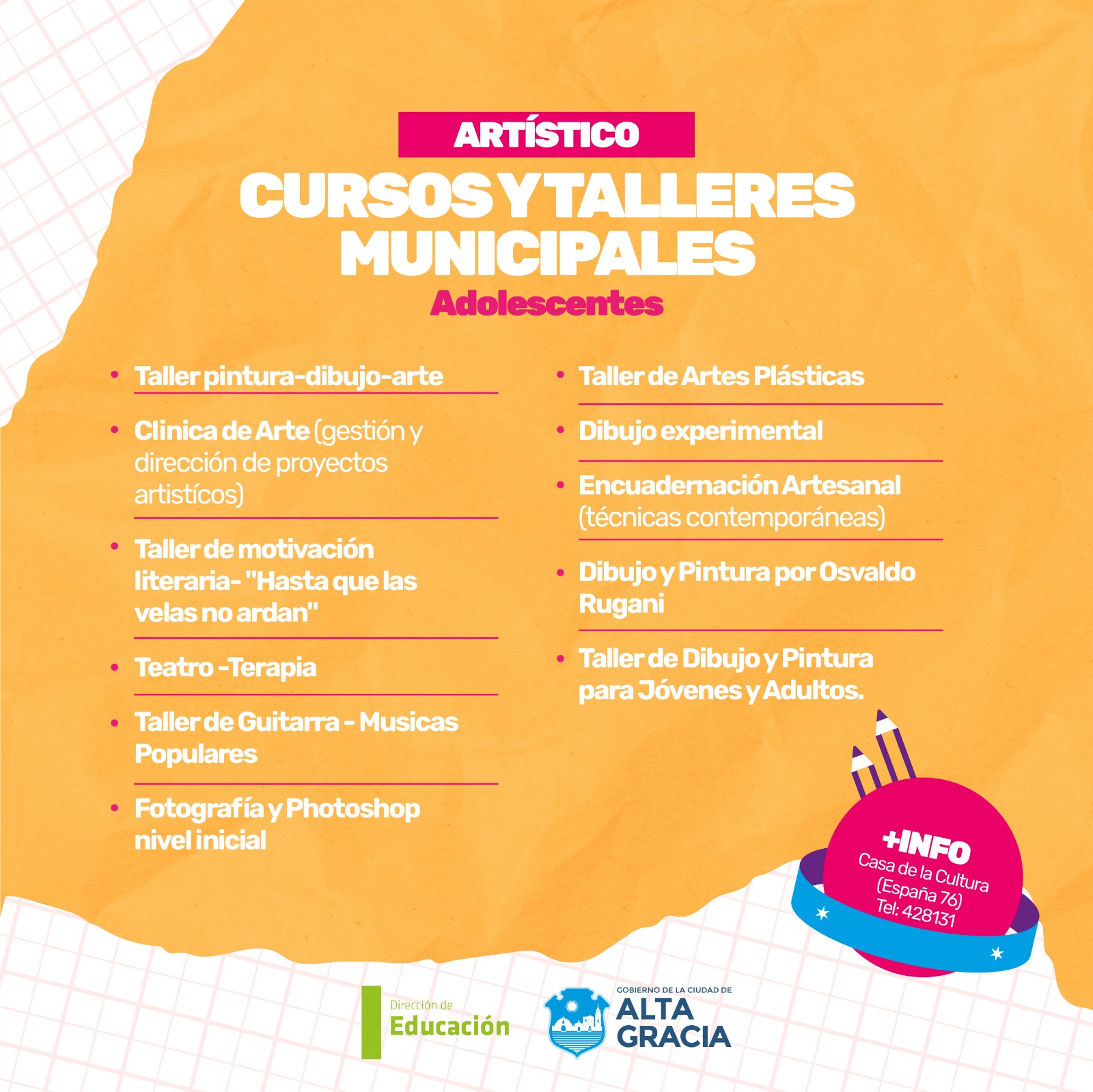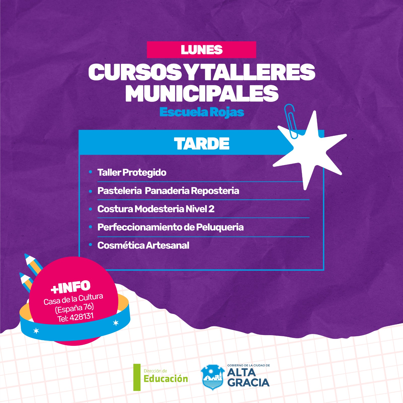 Por primera vez, la Dirección de Educación dependiente de la Secretaría de Gestión Publica, Turismo Cultura y Deportes del Gobierno de Alta Gracia, pone a disposición más de 100 propuestas de formación en oficios, arte, salud, idiomas, nuevas tecnologías y ambiente, con la intención de brindar más educación y con ello más oportunidades a los vecinos y vecinas de nuestra ciudad.
