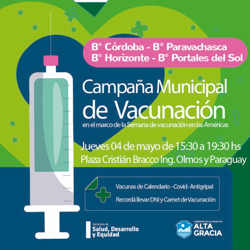 La Secretaría de Salud Desarrollo y Equidad, informa a los vecinos que el día mañana jueves 4 de mayo, en el marco de la Campaña de Vacunación Municipal, se realizará una jornada de vacunación en espacios públicos de nuestra ciudad.