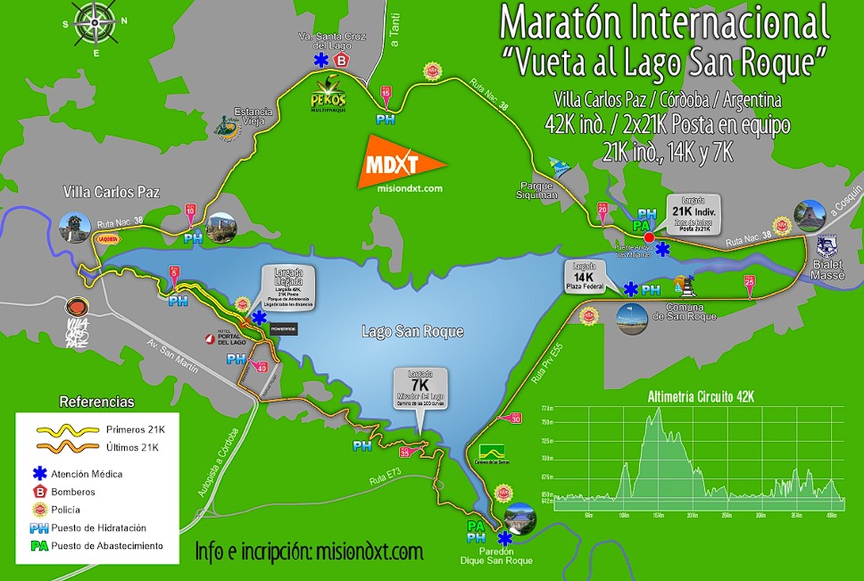 «La maratón de 42km rodeando el Lago San Roque es uno de los desafíos más importantes que todo deportista puede tener en su trayectoria como Runner, en un circuito impresionante donde se entremezclan diferentes escenarios geográficos, recorriendo la costanera sobre la ciudad de Carlos Paz, en este maravilloso entorno natural vas a poder ser partícipe de uno de los circuitos más bellos de Sudamérica». Mision DXT