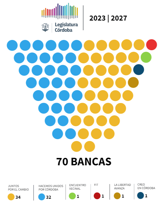 Juntos por el Cambio (34 legisladores) y Hacemos por Córdoba (32) acumulan la mayoría. Luego aparecen Encuentro Vecinal, La Libertad Avanza, el Frente de Izquierda y Creo en Córdoba de Todos, con un representante cada uno.