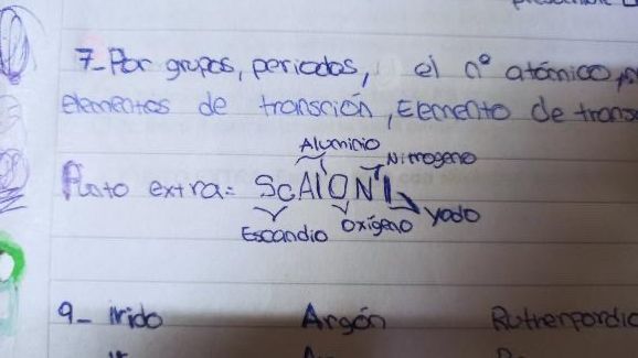 «Escribir palabras con símbolos químicos»: Esa fue la consigna que les dio un profesor de química en un examen, a un grupo de adolescentes de tercer año de la Escuela «Juana Azurduy» IPET 118, en Anisacate.