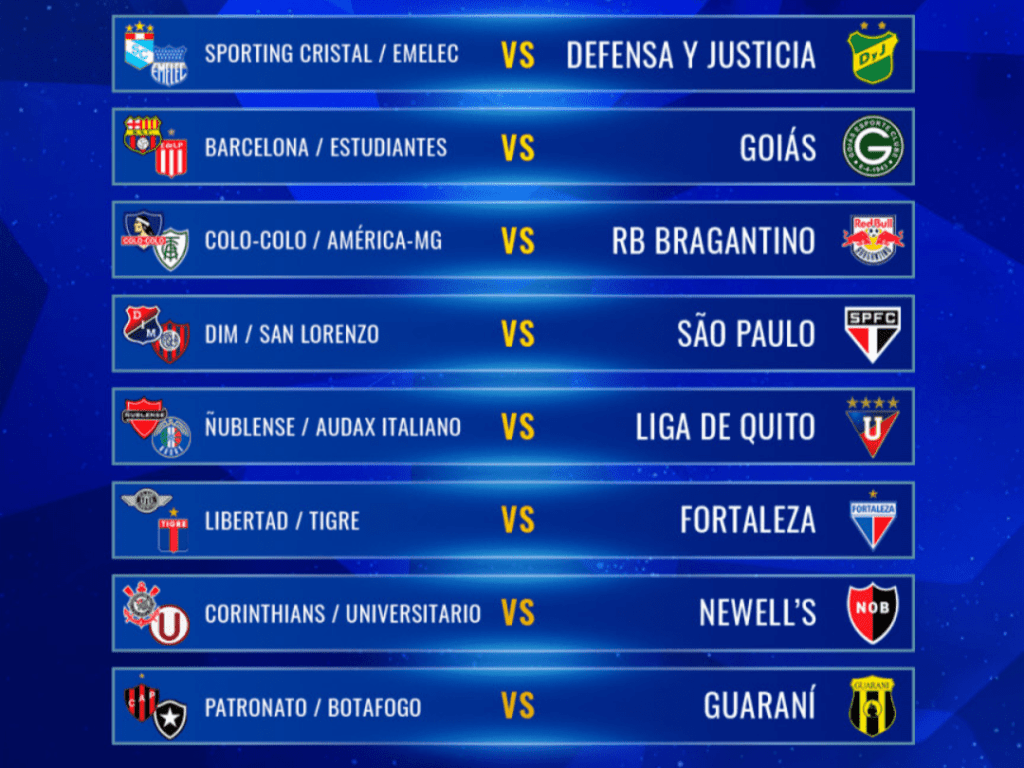 En los 16avos, Estudiantes se medirá ante Barcelona de Guayaquil (Ecuador) y quien venza en la serie, jugará ante Goiás (Brasil). Mientras que los cuervos de Boedo, se enfrentará ante Independiente de Medellín (Colombia). El ganador, avanzará a octavos para jugar contra uno de los equipos más poderosos del continente, São Paulo.