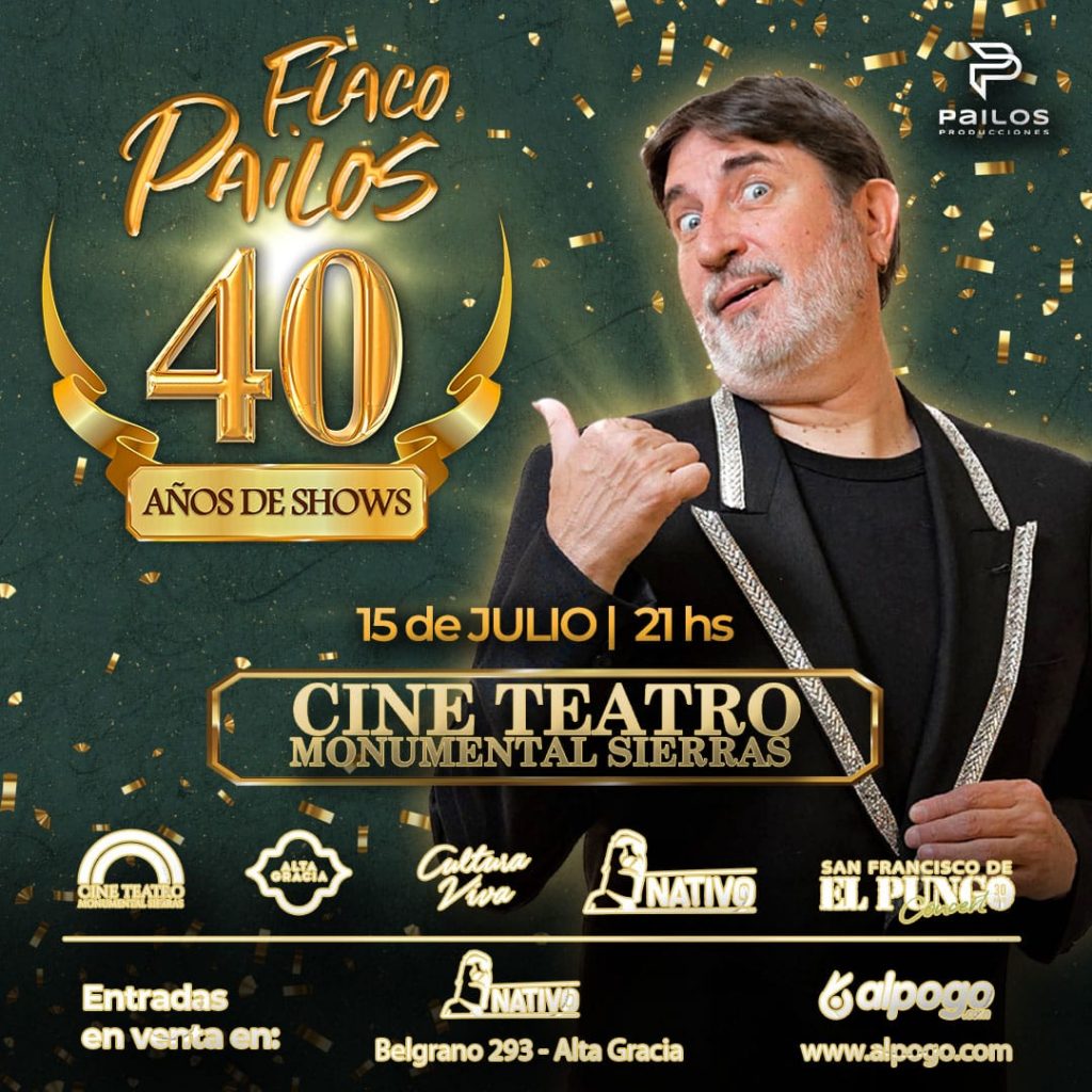 - 21hs El Flaco Pailos presenta “40 años de shows”: El consagrado humorista llega a nuestra ciudad para disfrutar junto al público de un espectáculo repleto de humor, repasando los distintos momentos de su larga trayectoria, y que se distingue además por incorporar en su repertorio los chistes favoritos que los espectadores le piden. Cine Teatro Monumental Sierras. Entradas a la venta en el sitio alpogo.com