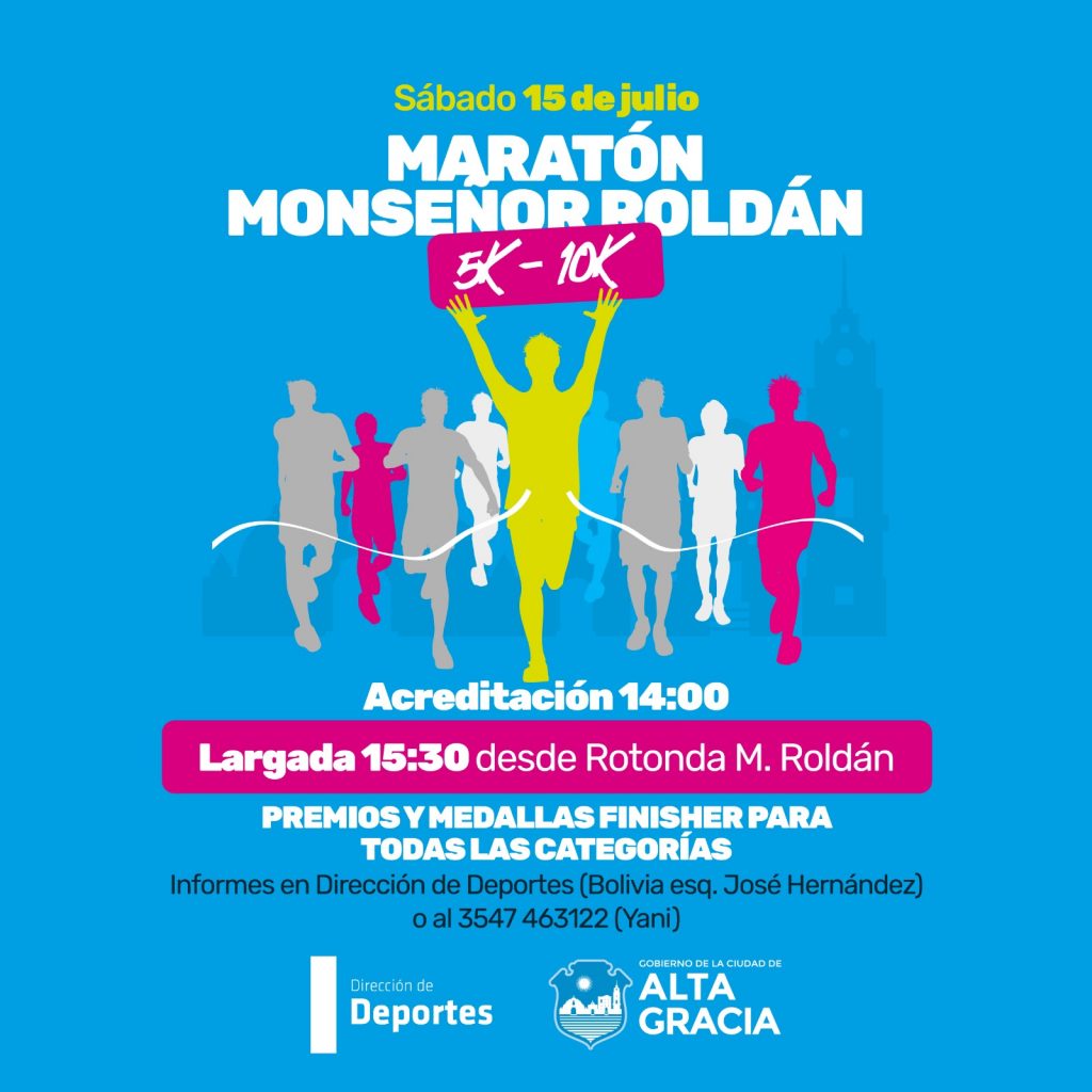 - 15.30hs Maratón Monseñor Roldán: Un nuevo evento deportivo congregará a atletas de toda la región en una maratón que recorrerá los hermosos paisajes del sector oeste de la ciudad. Habrá premios para todas las categorías, con dos modalidades de 5K y 10K. Participarán corredores a partir de los 12 años de edad. Acreditaciones a partir de las 14hs, largada 15.30hs. En rotonda Monseñor Roldán.