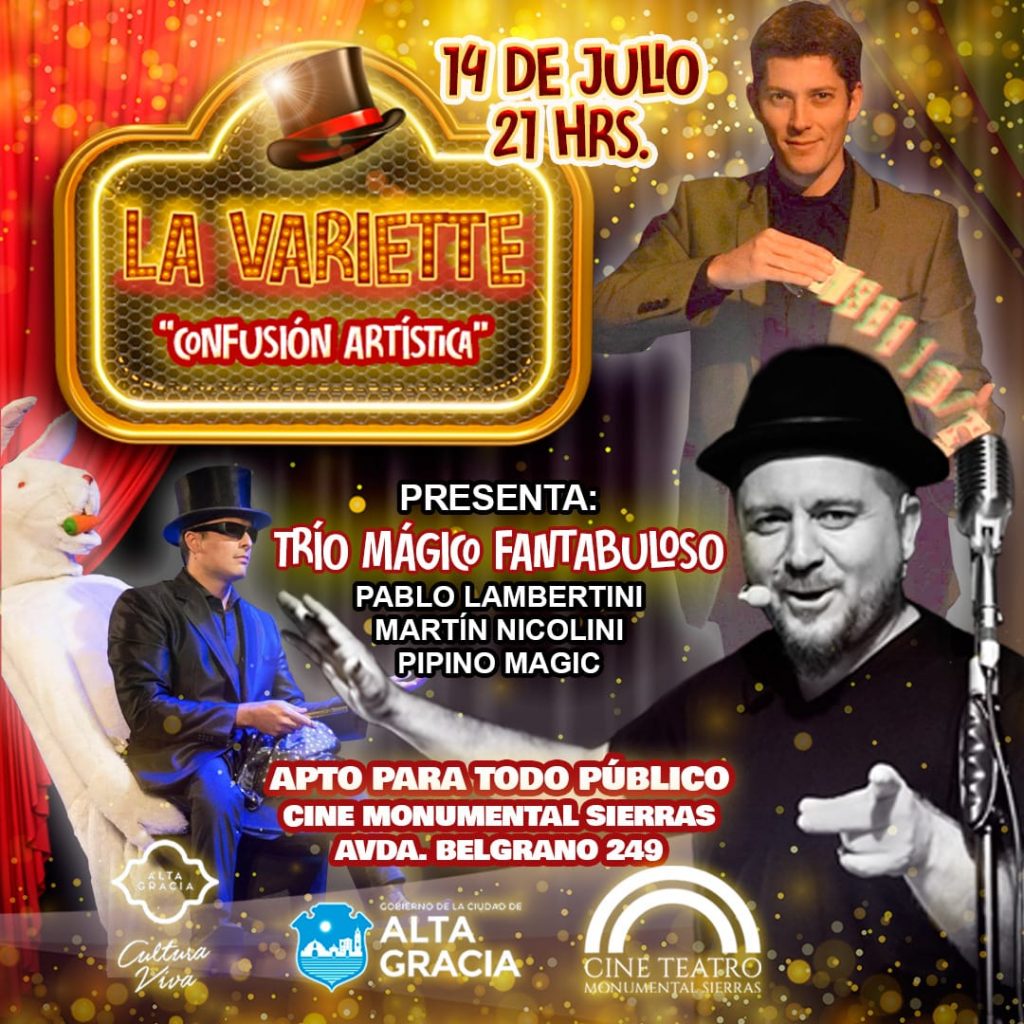 - 21hs La Varietté 3: El «Trío mágico fantabuloso»: Asombroso espectáculo que fusiona la magia y el ilusionismo en una experiencia única y cautivadora. Con Martin Nicolini (campeón argentino), Pablo Lambertini (campeón latinoamericano) y el reconocido local Pipino Magic; quienes se desafían en una competencia amistosa y con mucho humor. Cine Teatro Monumental Sierras.