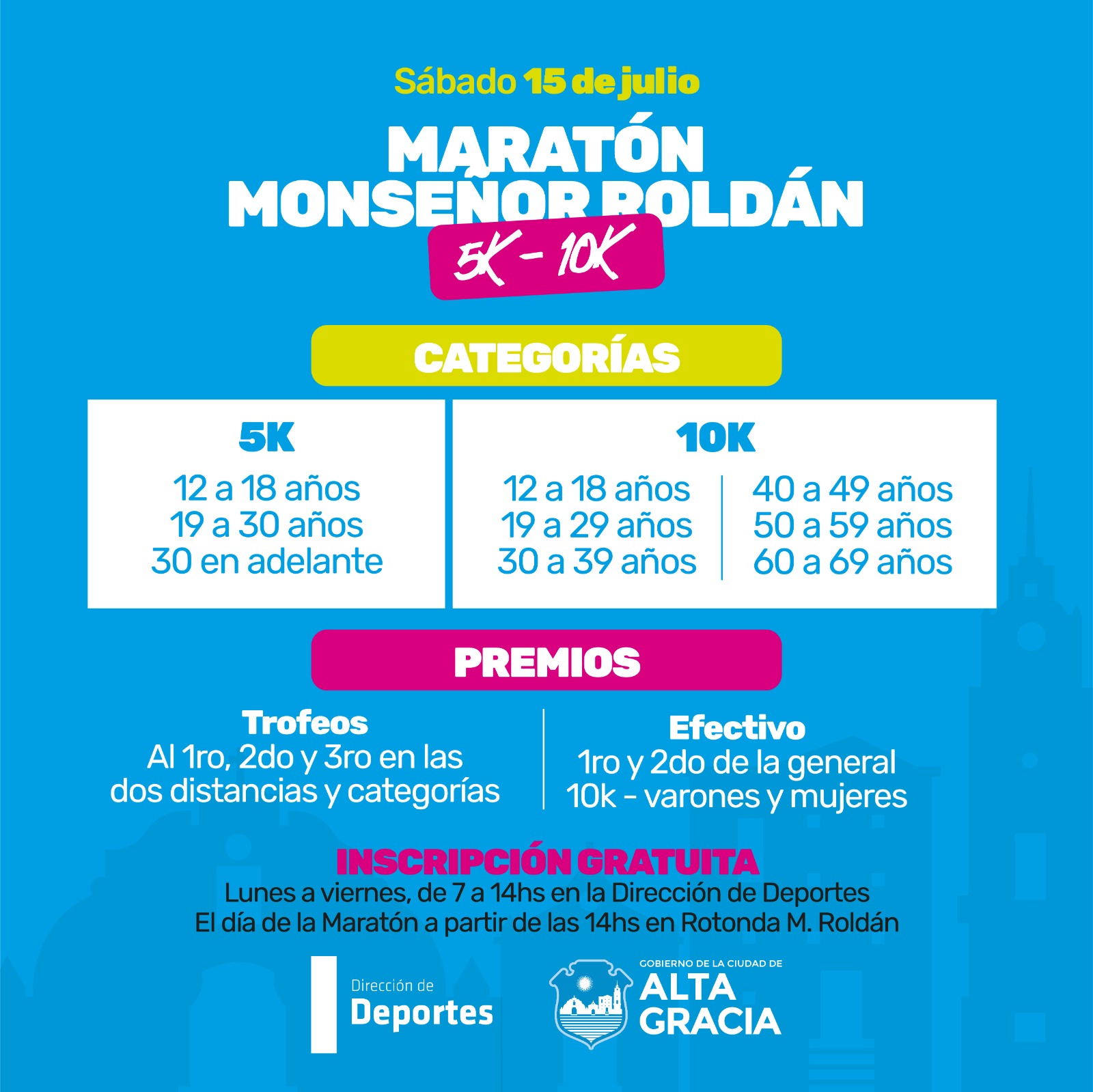 La maratón se desarrollará en dos modalidades, 5K y 10K, y podrán participar deportistas desde los 12 años de edad. Las acreditaciones se realizarán a partir de las 14hs en la Rotonda Monseñor Roldán, mientras que la maratón comenzará a las 15.30hs. Habrá trofeos y, en la general de 10K, también premios en efectivo para los primeros puestos.