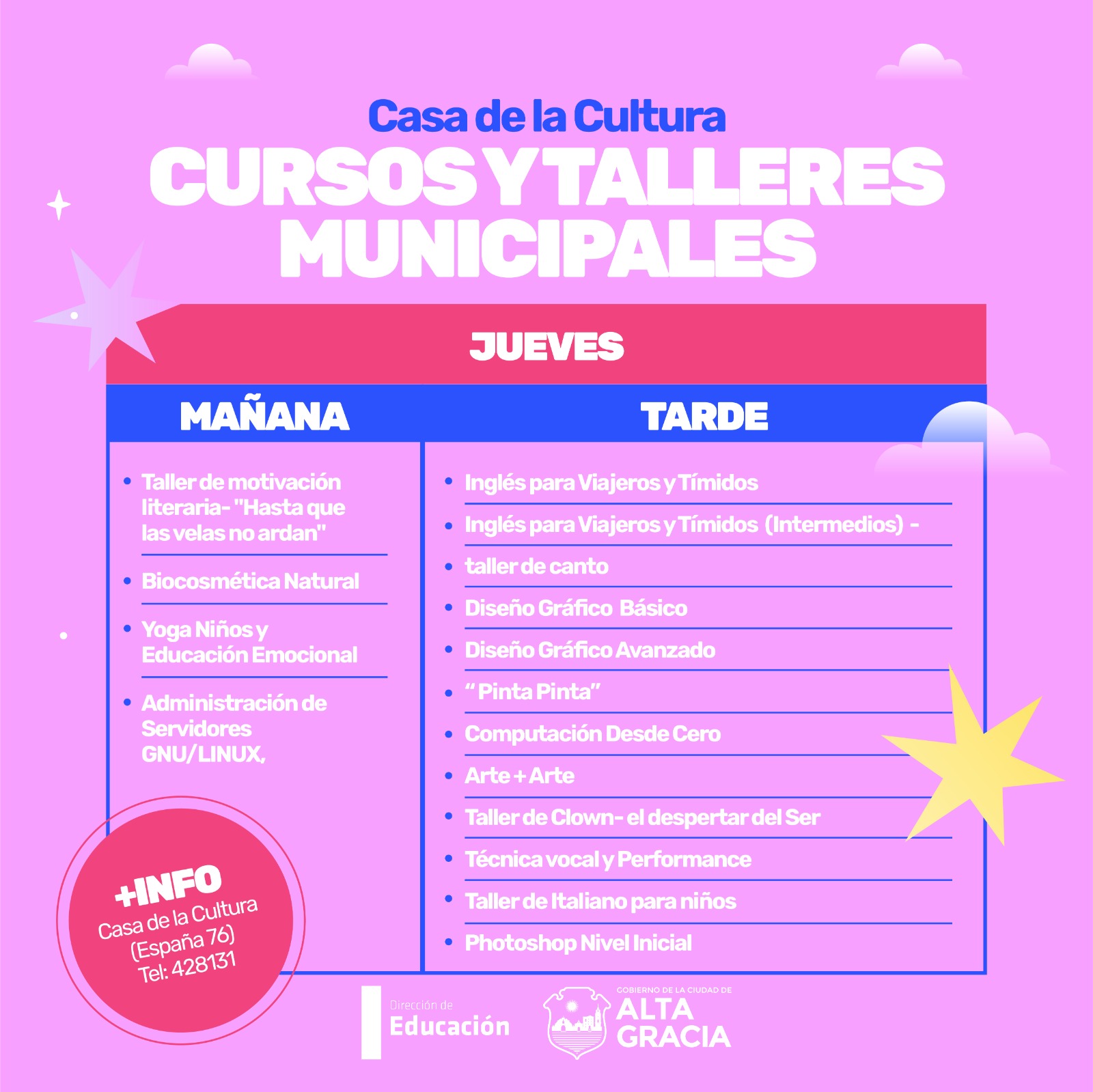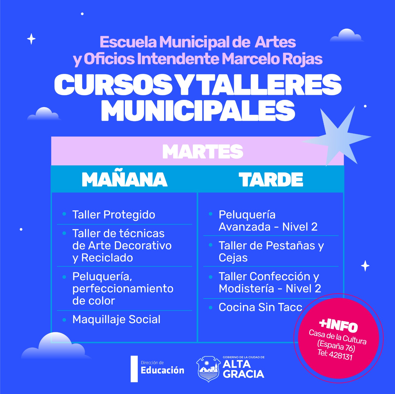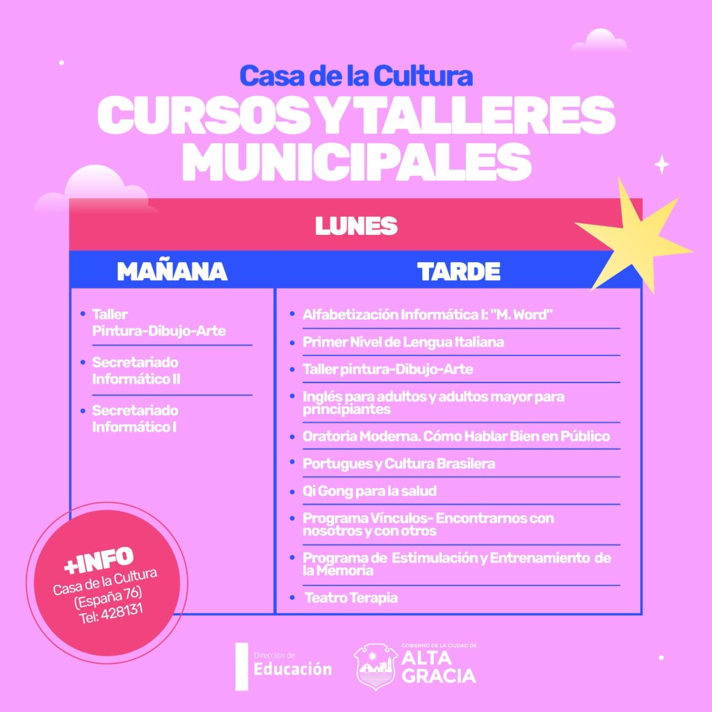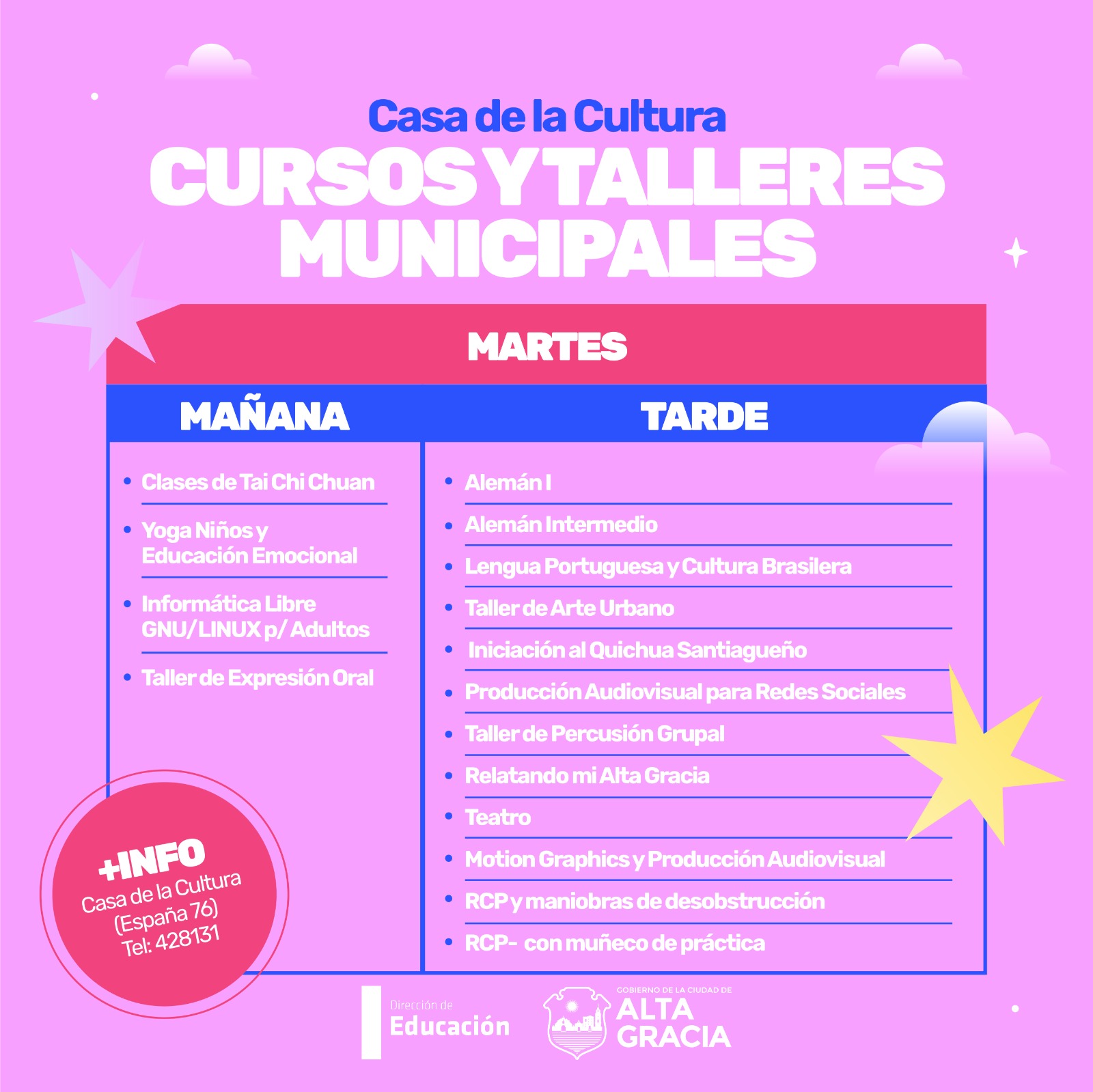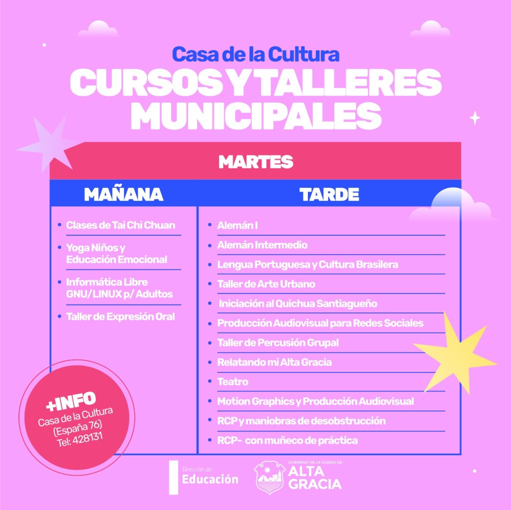 Los cursos y talleres se refieren a temas como oficios, artes, cuidado de la salud y ambiente, nuevas tecnologías, idiomas, etc. Están destinados a todas las edades y se realizan de lunes a sábados en cuatro espacios de formación.
