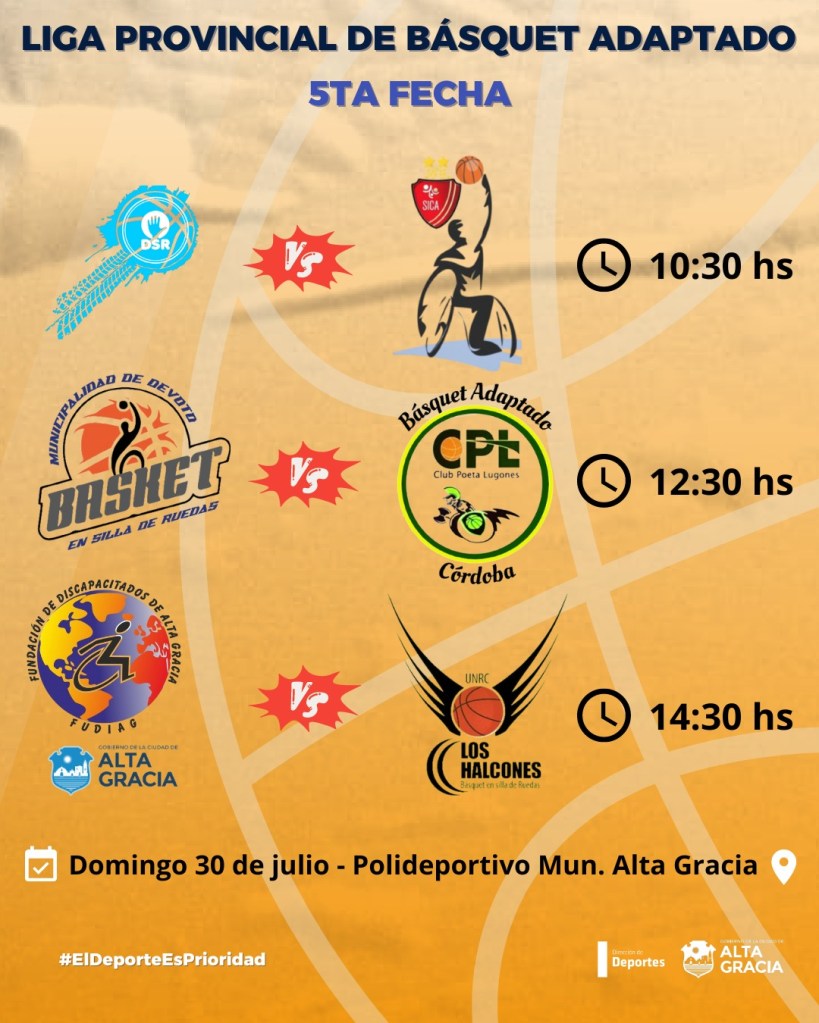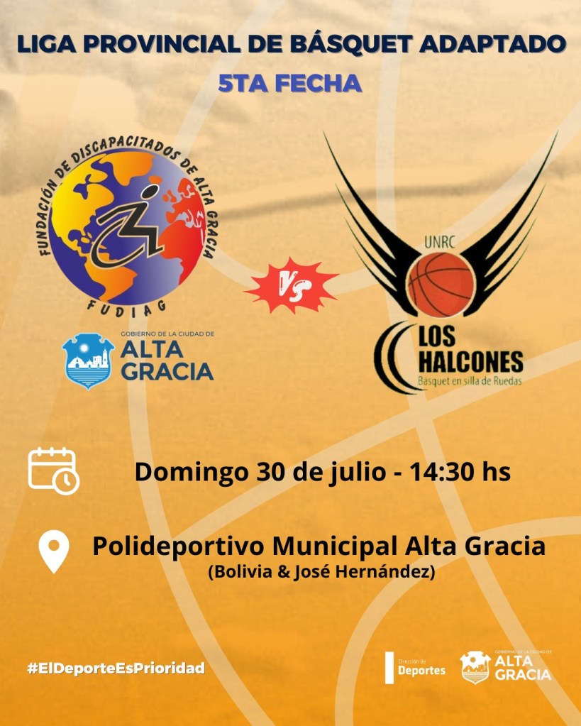 El próximo domingo 30 de julio, en el Polideportivo Municipal de Alta Gracia, se llevará a cabo la quinta fecha de la 𝘓𝘪𝘨𝘢 𝘗𝘳𝘰𝘷𝘪𝘯𝘤𝘪𝘢𝘭 𝘥𝘦 𝘉á𝘴𝘲𝘶𝘦𝘵 𝘈𝘥𝘢𝘱𝘵𝘢𝘥𝘰.