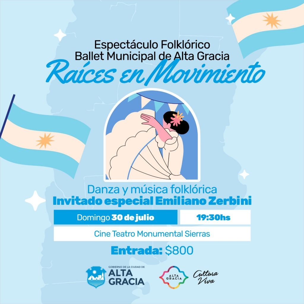 - +19.30hs Raíces en Movimiento: El Ballet Municipal de Alta Gracia brindará un gran espectáculo folclórico para disfrutar de toda nuestra cultura nacional, con la participación especial del gran Emiliano Zerbini. Entradas a la venta en el Galpón Municipal de Bv. Alfonsín esq. Bolivia.