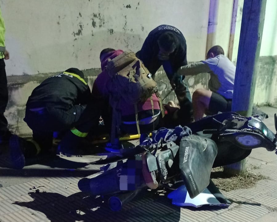 Producto del impacto, el motociclista terminó subiéndose a la vereda de la Iglesia; y tras ser asistido, debió ser trasladado al Hospital Regional Arturo Illia a razón de sufrir politraumatismos varios.
