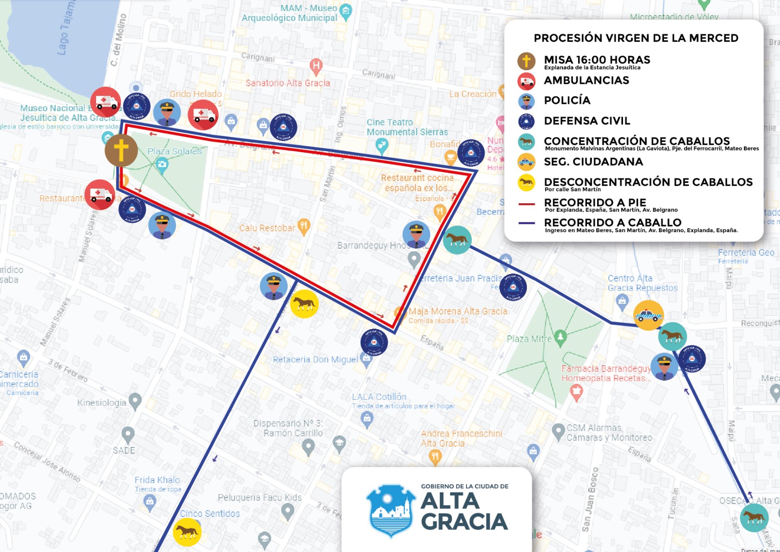 En dicho marco, la Municipalidad de Alta Gracia participará aportando tareas de control de tránsito con la Secretaría General, asistencia sanitaria del personal de la Secretaría de Salud; personal de Defensa Civil y Seguridad Ciudadana trabajando en coordinación con las fuerzas policiales; tareas de limpieza a cargo de la Secretaría de Servicios Públicos, y tareas de coordinación a través de la Secretaría de Gestión Pública; con el objetivo de asistir a los miles de fieles que este año asistan al centro de la ciudad a participar de esta celebración.