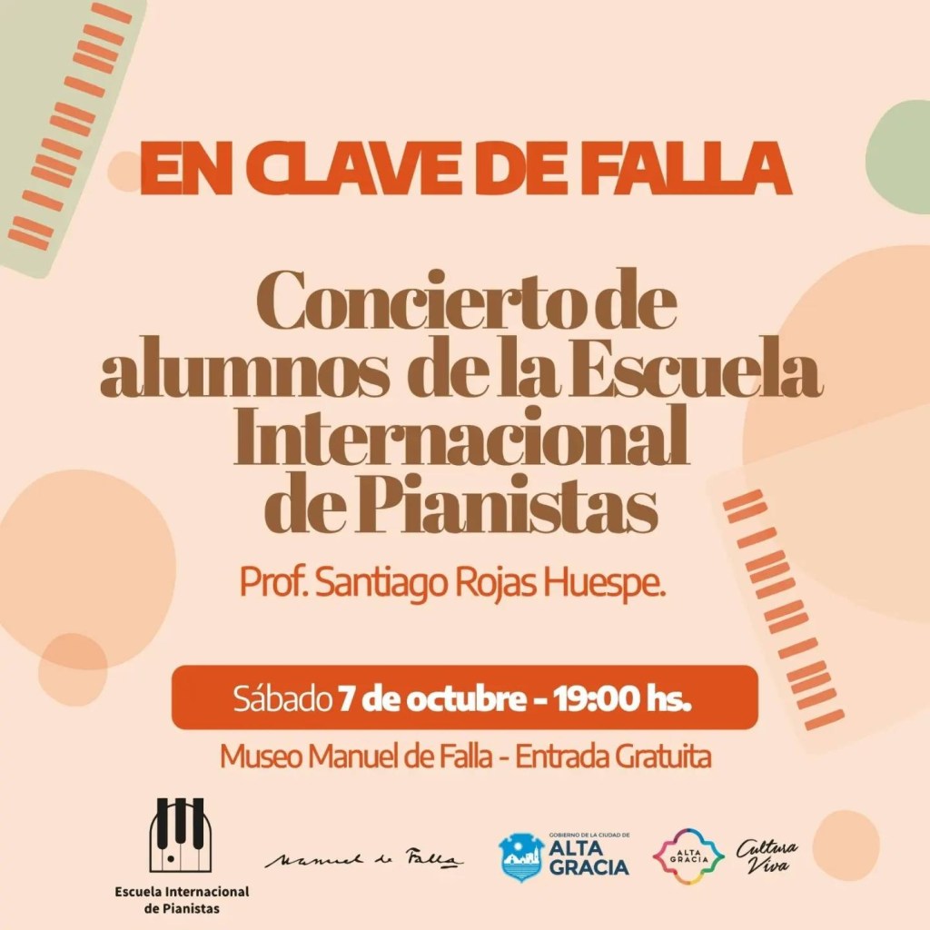 - A las 19hs se llevará a cabo «En Clave de Falla», una nueva edición del ciclo que acerca diversas expresiones musicales para el disfrute del público en general. En esta oportunidad, se brindará un concierto de la Escuela Internacional de Pianistas, a cargo del Profesor Santiago Rojas Huespe. El concierto tendrá lugar en el Museo Manuel de Falla y la entrada es libre y gratuita.