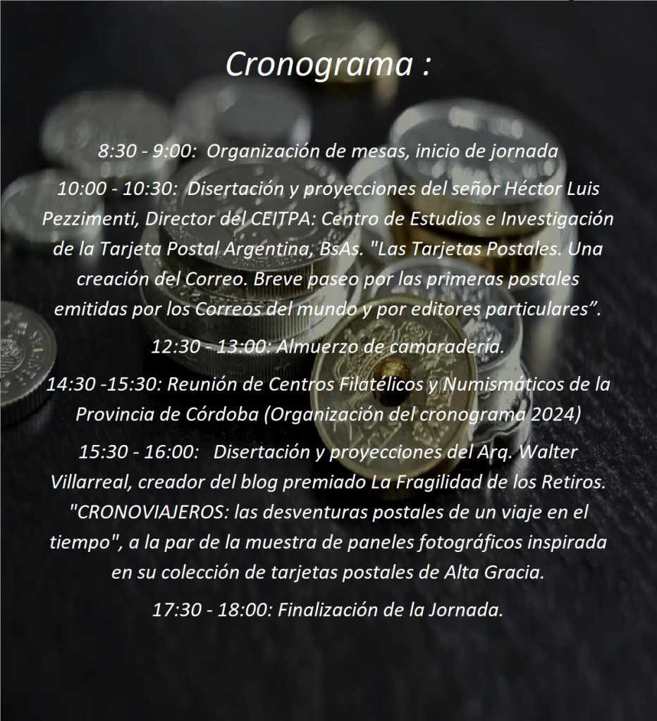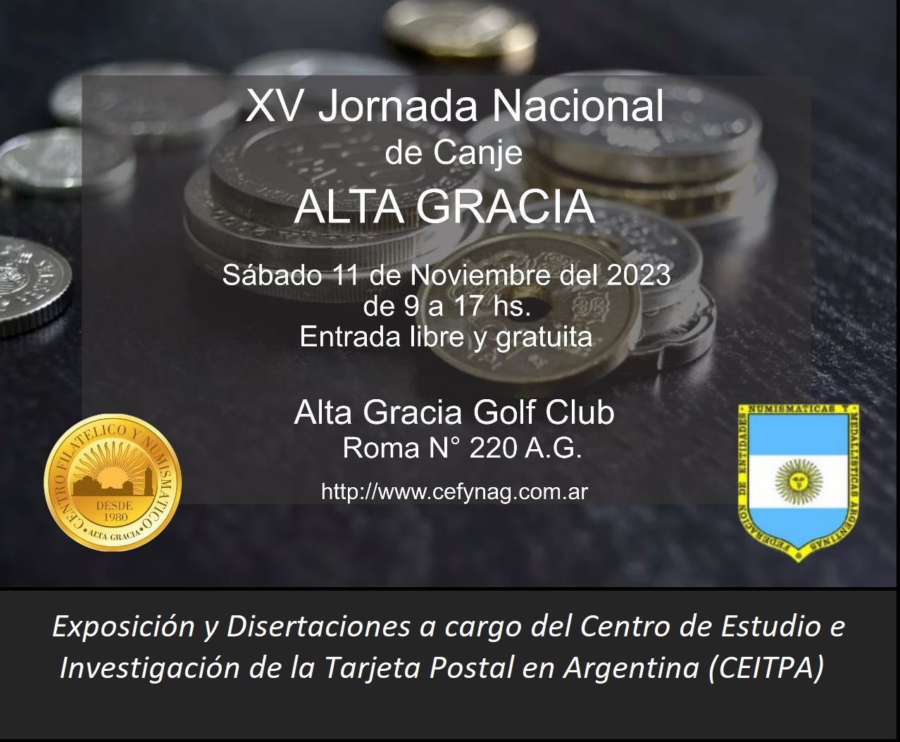 El Centro de Filatelia y Numismática de Alta Gracia, con el apoyo de la Federación de Entidades Numismáticas y Medallistas Argentinas, organiza esta «XV Jornada Nacional de Canje», un encuentro donde coleccionistas y amantes de este apasionante mundo podrán intercambiar distintos objetos de su interés, como monedas, postales, medallas y mucho más. Además, en la jornada se realizarán disertaciones y exposiciones a cargo del Centro de Estudio e Investigación de la Tarjeta Postal en Argentina. Alta Gracia Golf Club, entrada libre y gratuita.