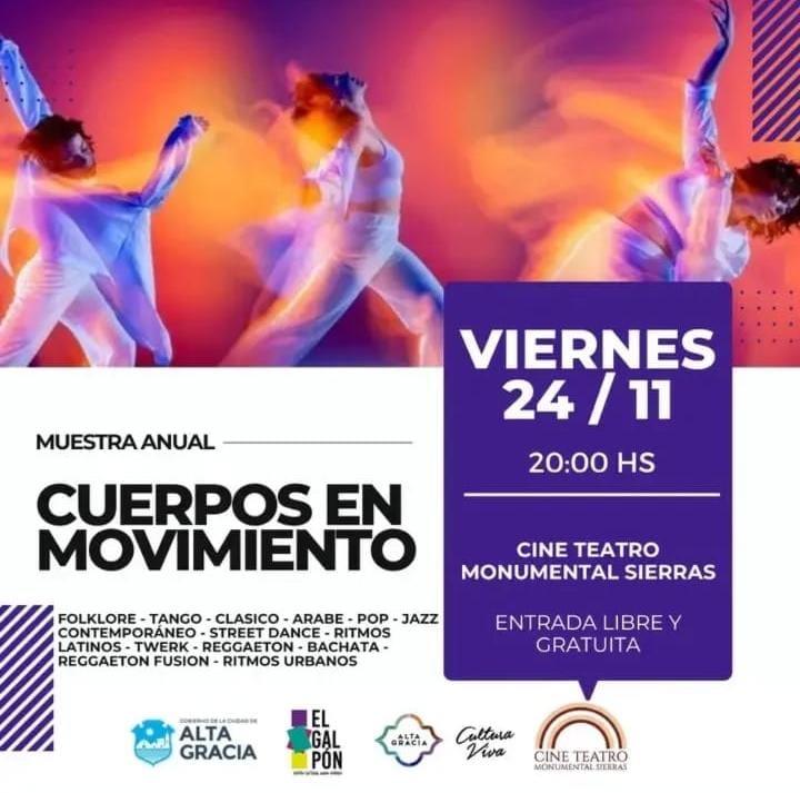 - 20hs “Cuerpos en Movimiento”: Muestra anual de los diversos cursos y talleres que funcionaron a lo largo de todo el año en el Galpón Cultural Municipal. Cine Teatro Monumental Sierras. Entrada libre y gratuita.