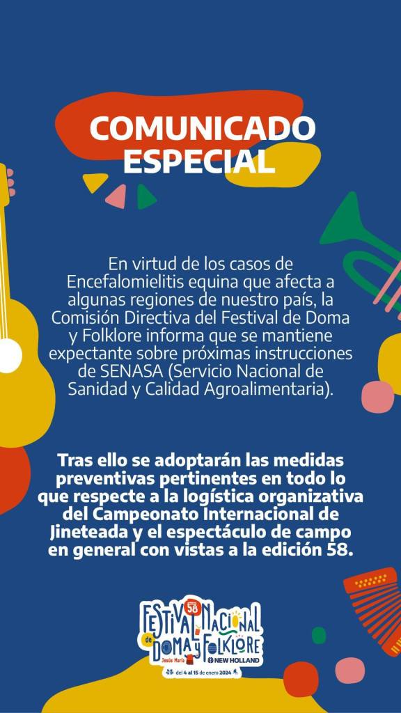 En virtud de los casos de Encefalomielitis equina que afecta a algunas regiones de nuestro país, la Comisión Directiva del Festival de Doma y Folklore informa que se mantiene expectante sobre próximas instrucciones de SENASA (Servicio Nacional de Sanidad y Calidad Agroalimentaria).