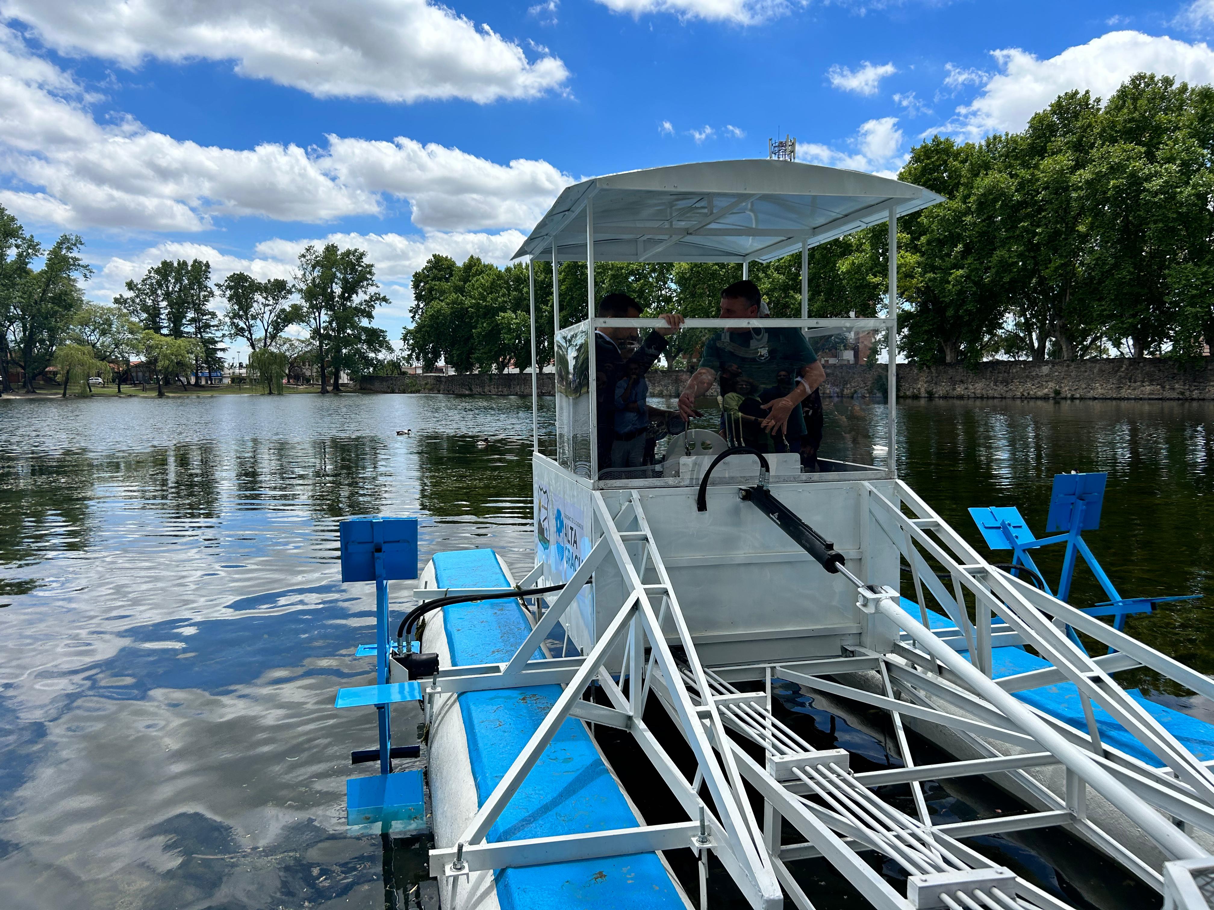 La maquinaria, que permitirá un mejor control biológico de los juncos y algas que crecen en el Tajamar, fue construida por alumnos y personal docente de la institución educativa, en un trabajo conjunto con la Municipalidad.