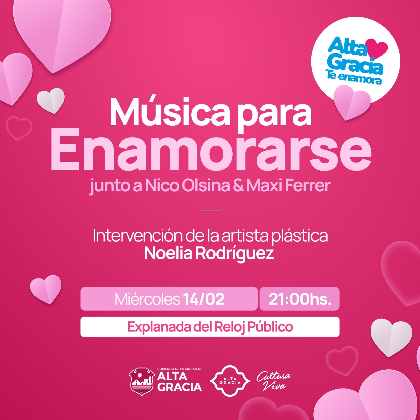 DÍA DE LOS ENAMORADOS – La explanada del Reloj Público se llenará de arte y música para enamorarse, con las actuaciones en vivo de Nico Olsina y Maxi Ferrer; e intervenciones de pintura en vivo de mano de la artista plástica Noelia Rodríguez. Reloj Público, a partir de las 21hs.