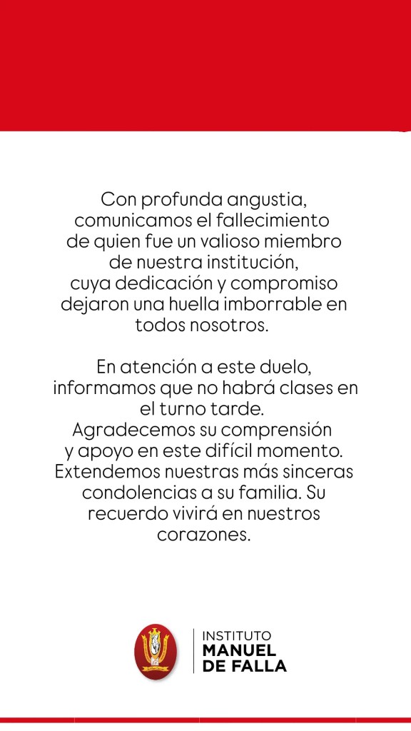 El reconocido colegio compartió en sus redes sociales un sentido comunicado y suspendió las clases de este viernes para el turno tarde en señal de duelo.