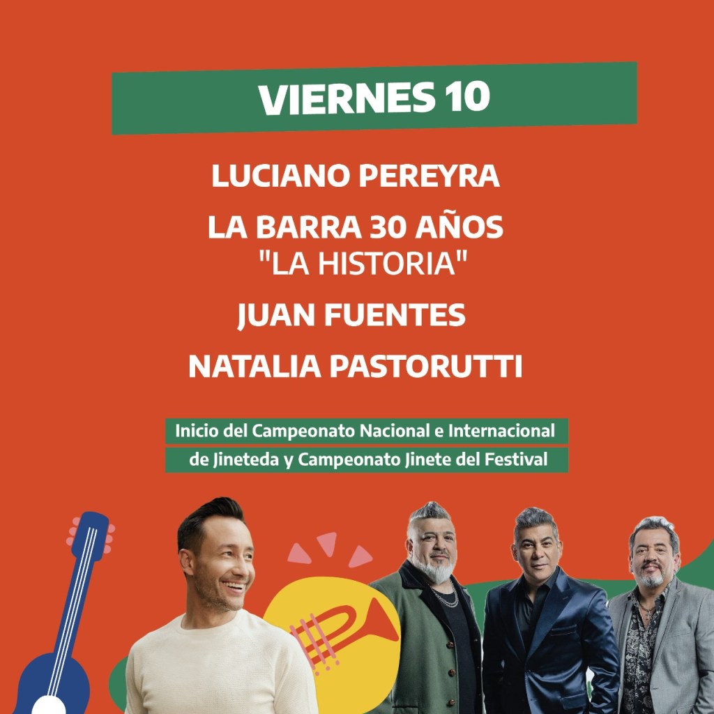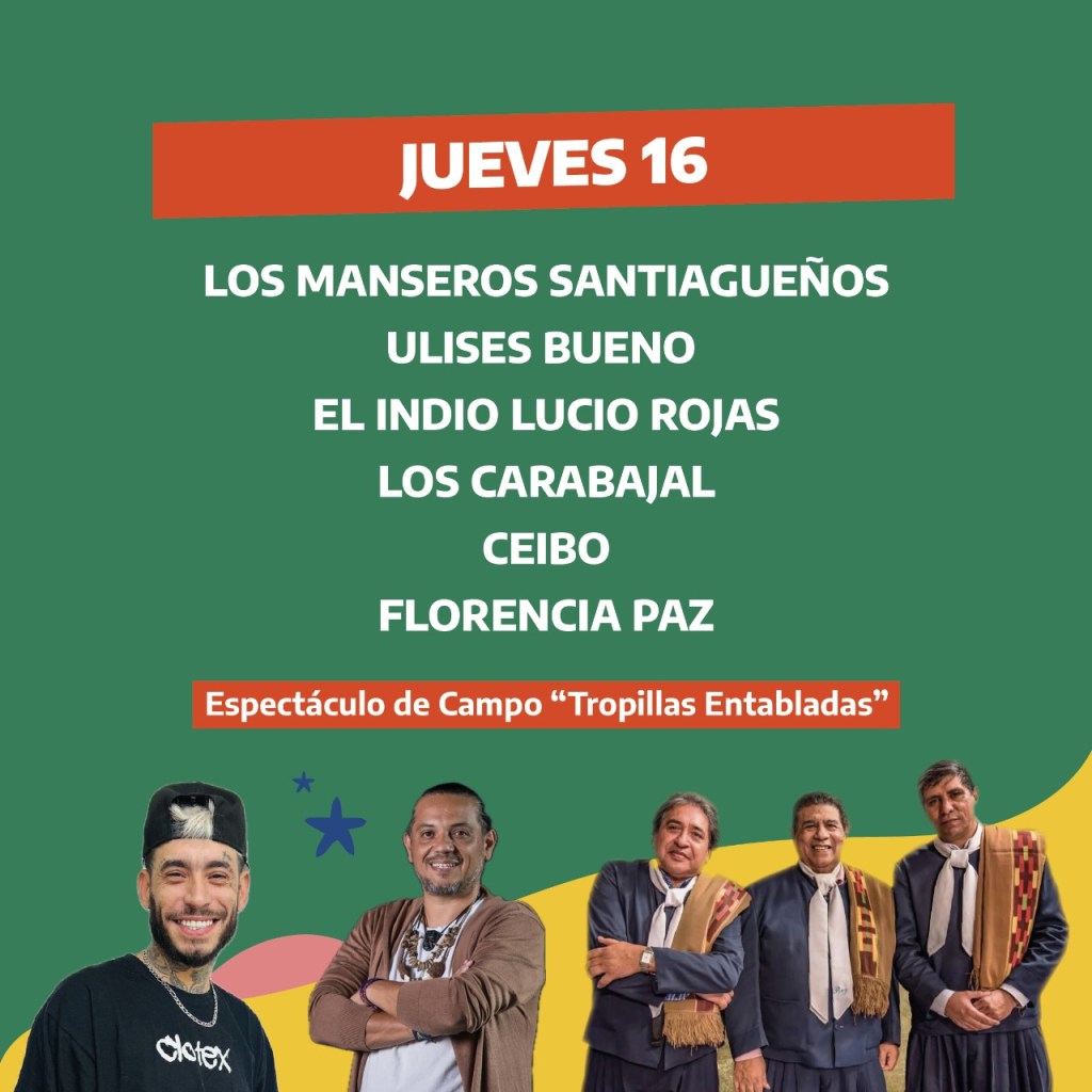 Para seguir en ese orden, vale decir que estarán Abel Pintos, Luciano Pereyra, Jorge Rojas, El Indio Lucio Rojas, Soledad, Chaqueño Palavecino, Nahuel Pennisi, Los Nocheros, Los Carabajal y Los Manseros Santiagueños, entre los nombres de mayor convocatoria.