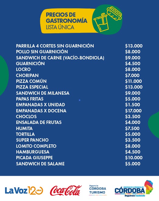 Por su parte, en relación a las comidas, una parrilla con cuatro cortes costará 13 mil pesos, el pollo sin guarnición 8 mil pesos, un sándwich de carne a 9 mil pesos, y el locro a 8 mil pesos. Otros platos como el choripán, la pizza, las empanadas, la tortilla, el super pancho, el lomito completo, y la hamburguesa tendrán precios que oscilarán entre los 3.500 y los 11 mil pesos.