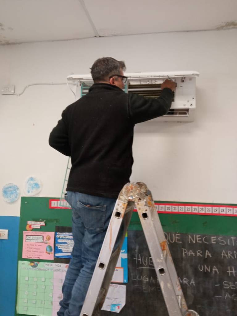 Por su parte, en la Escuela San Martín se está realizando la conexión eléctrica en cuatro salas para la próxima instalación de equipos de aire acondicionado adquiridos por la cooperadora escolar.